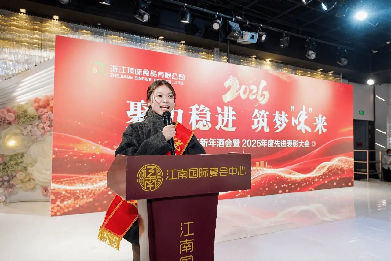 优秀员工代表雷玲娜上台发言。她结合自身岗位,分享了在顶味大家庭中成长、奋斗的感悟,话语真挚、力量十足,表达了与公司同频共振、共筑“味”来的决心。